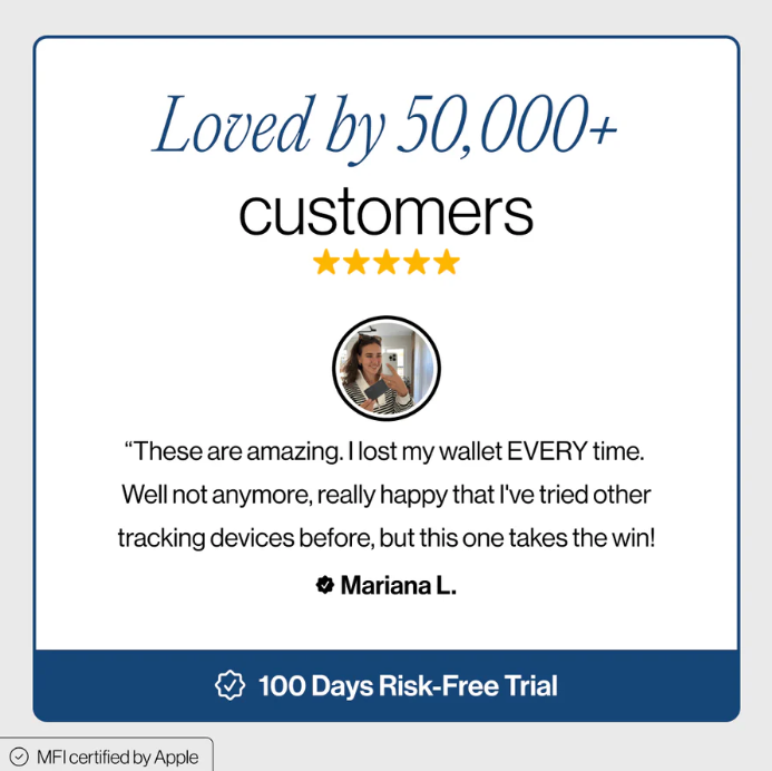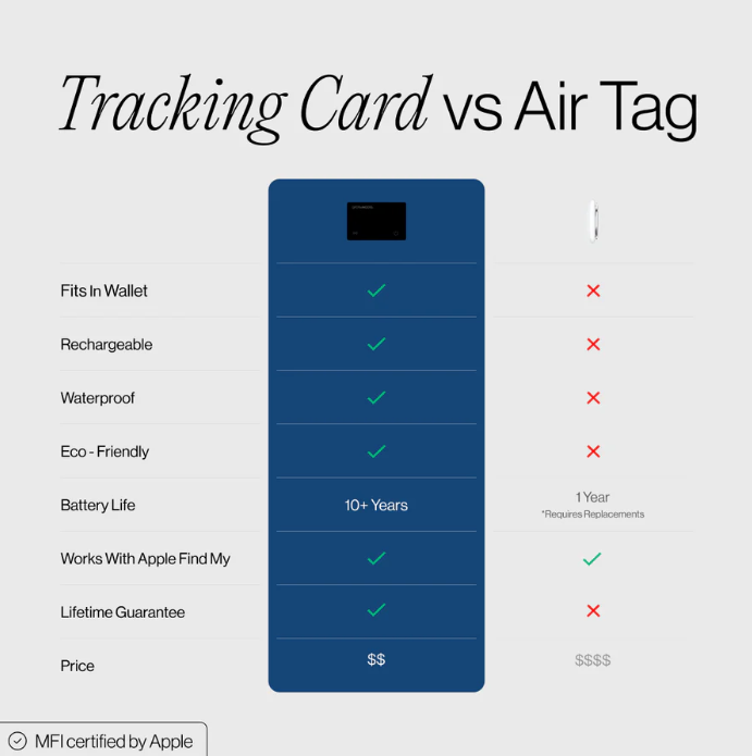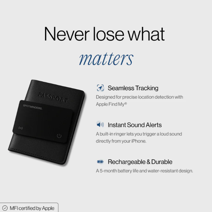 Pairs instantly with Apple’s Find My — no monthly fees, no extra apps.